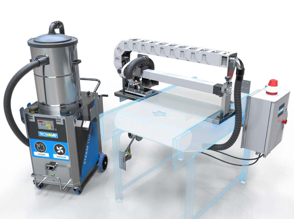 Automatizovaný systém čistenia a dezinfekcie sieťových dopravných pásov. Prispôsobiteľný z hľadiska rozmerov a upevnenia. Dodáva sa s príslušnými tesneniami podľa oblasti použitia. Aplikácia je možná po ukončení výrobného procesu aj počas výrobného cyklu. Použiteľný s parnými generátormi Steam Box Industrial alebo Profesional, Steam Plant (s výkonom 14,4 kW až 36 kW a s funkciou vysávania).